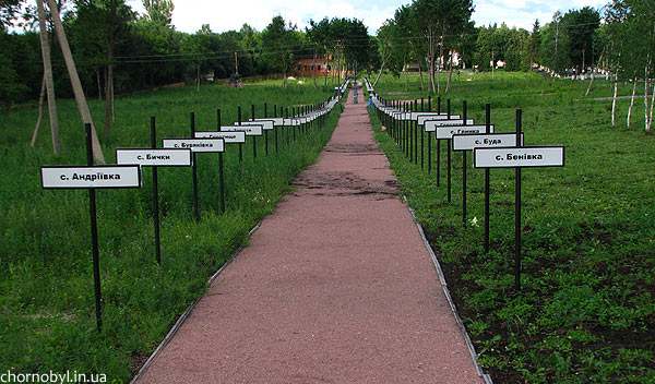 Алея Памяти мемориального комплекса "Звезда Полынь". Собраны указатели всех населенных пунктов зоны отчуждения ЧАЭС