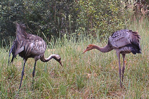 Другие классные снимки посвящены семейству журавлей. Еще один «краснокнижник» в нашей копилке ценностей. Так случилось, что я их встретил еще раньше, в начале июня, когда птенец был совсем мал. Каково же было удивление, что они таки добрались до одной из камер (там около километра), потом вернулись спустя месяц, и, более того, устроили перед камерой самую настоящую «фотосессию» с танцами! Супер!