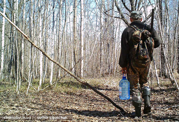 Фотосъемка с помощью автоматических фотокамер преподнесла и некоторые сюрпризы. Один из них вряд ли можно назвать приятным, но он отражает реалии Чернобыльской жизни. Как бы эта земля не была глуха и дика, но человек проникает кругом и далеко не всегда с благими намерениями. В одной точке камера сняла браконьера. Удивительно, что он ее не заметил!