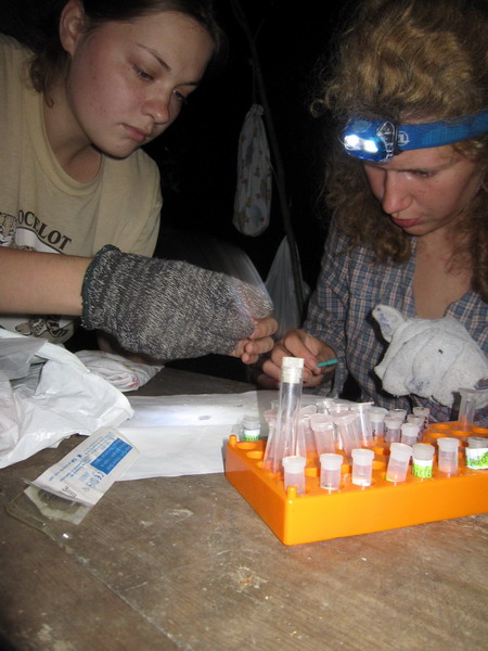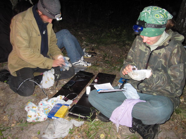 Ночью зверьков редко обрабатывают, оставляя в тряпичных мешочках до дневного, более благоприятного для этих дел времени. Но «утром» (обычно начинающимся после 11.00-12.00), когда ловцы «темной силы» постепенно приходят в себя, собственно и начинается научный процесс: каждого зверька осматривают, измеряют, описывают, при необходимости фотографируют и метят индивидуальным кольцом. Кстати, тоже хироптрологическим, не таким, как у птиц, а более изящным с закругленными краями . Способность летучих мышей жить по 10-20 лет, привязанность к местам размножений и зимовок, вкупе с алюминиевым «паспортом» на крыле открывают огромные возможности для исследований и охраны. Следует заметить, что в отличие от птиц, рукокрылые сравнительно легко переносят временную неволю, и даже без еды. Они не тратят лишнюю энергию, не бьются в истерике. Просто впадают в спячку. И эта замечательная особенность может проявиться от любого неблагоприятного обстоятельства, даже такого, как научный процесс. Проспать до следующей ночи без еды, даже если вас поймали в самом начале предыдущей – не вопрос! Главное, чтобы была подходящая температура и влажность.