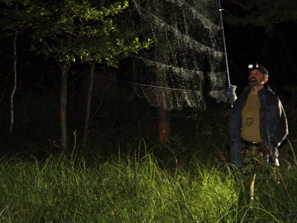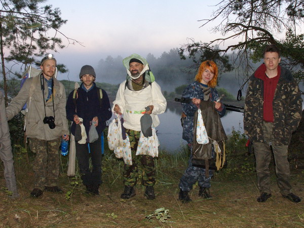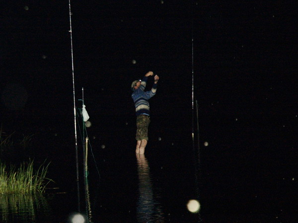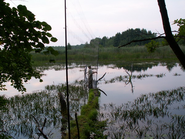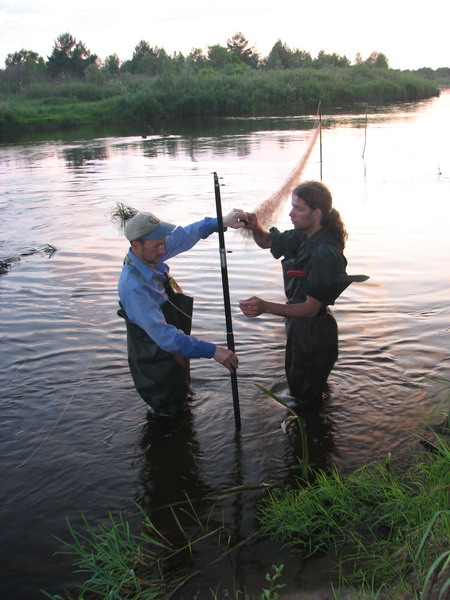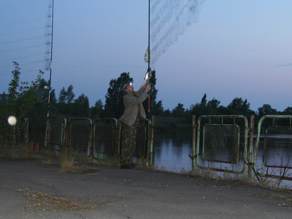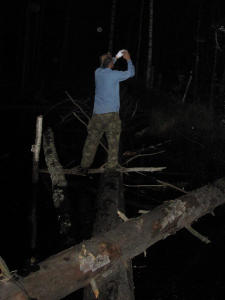 Это очень выматывающее занятие, особенно, если учесть, что людям ночью свойственно спать, а комары в таких местах особо остервенелые, а нетопырей и вечерниц успешно заменяют усачи и скарабеи (вот, уж, кто может сети рвать!). Да и погода бывает разная. То изнываешь от духоты, то борешься за остатки тепла, продрогший от росы и тумана (автор фото — Д.Вишневский). Бывало, стояли, как кони боевые (спрятаться некуда), «прижав уши», и стоически переживая хлещущий дождь и светопредставление налетевшей грозы, и мечтали, только б молния не ударила. А, уж, если гроза в лесу застала и все кругом качается, трещит и падает, то тут не до науки – спасать сети и себя!.. Еще более добавляют эмоции какие-либо экзотические способы и места отловов. Приходилось подобно акробату всю ночь бегать по бревну над лесным болотом, рискуя свернуть шею, торчать как цапля в реке или месить сероводородистую жижу.