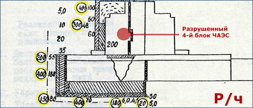 Уровни мощности экспозиционной дозы (Р/ч) на территории ЧАЭС на период начальной стадии строительства объекта «Укрытие». Значения обведенные желтым — МЭД на уровне 1 метра от земли по состоянию на 10 июня 1986 года. Не обведенные цифры — МЭД по состоянию на 22 июля 1986 года.