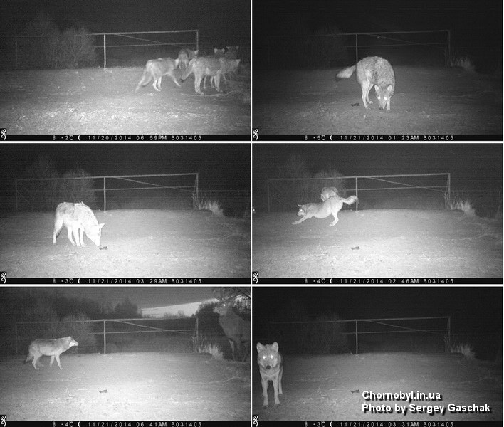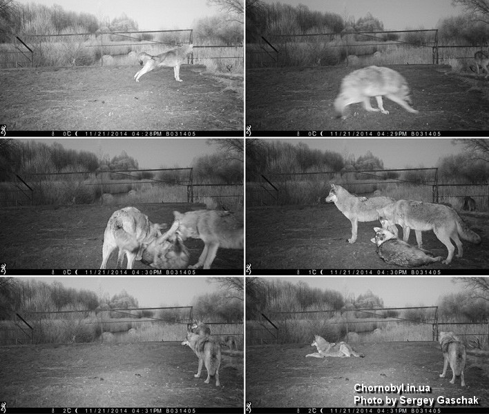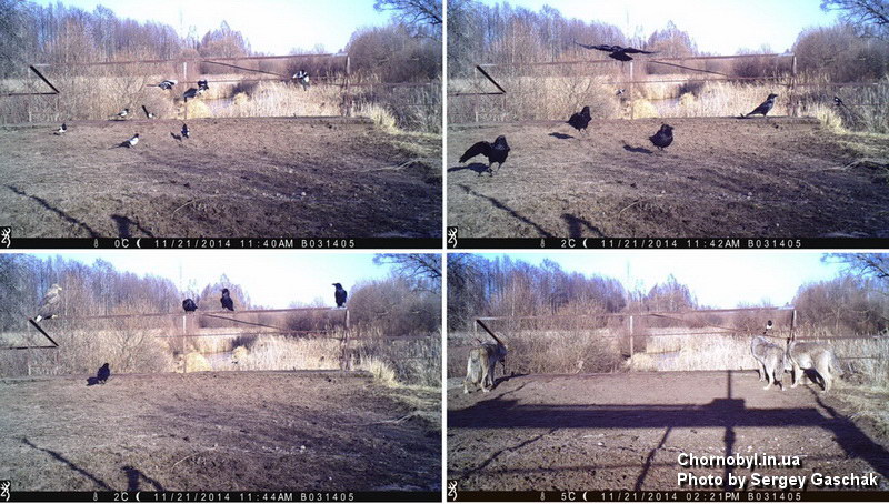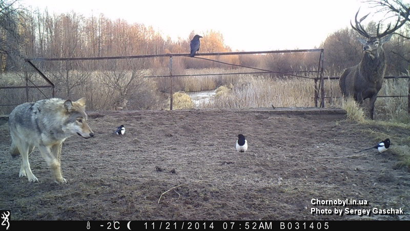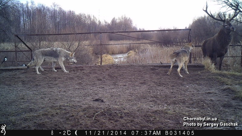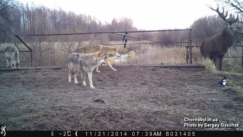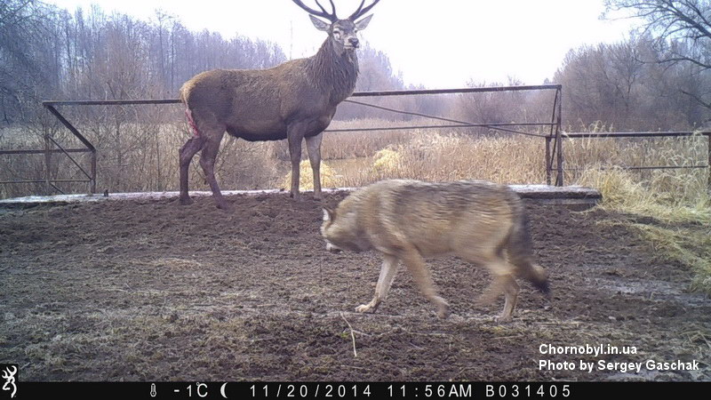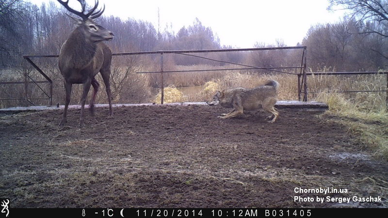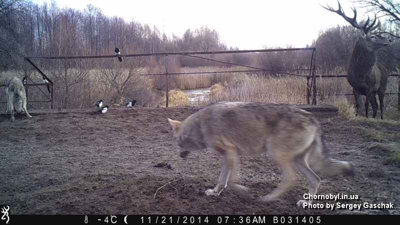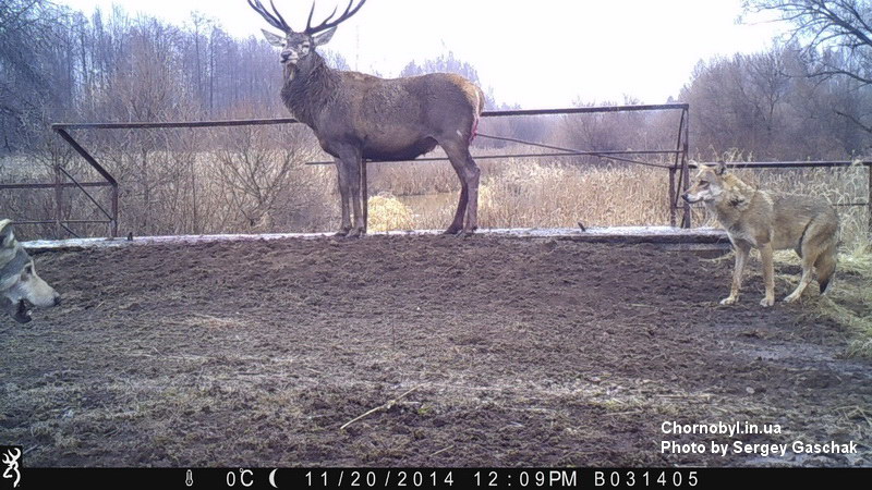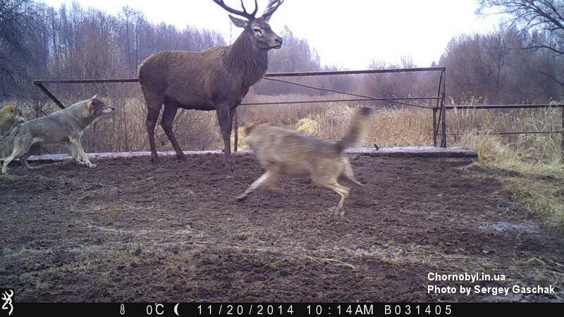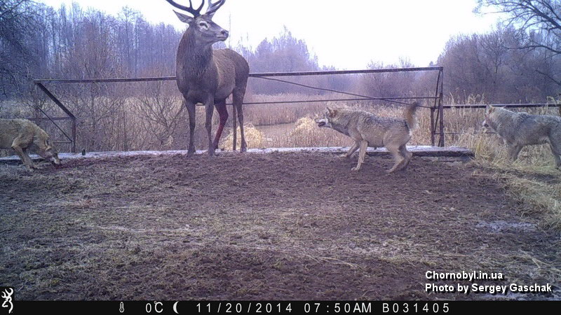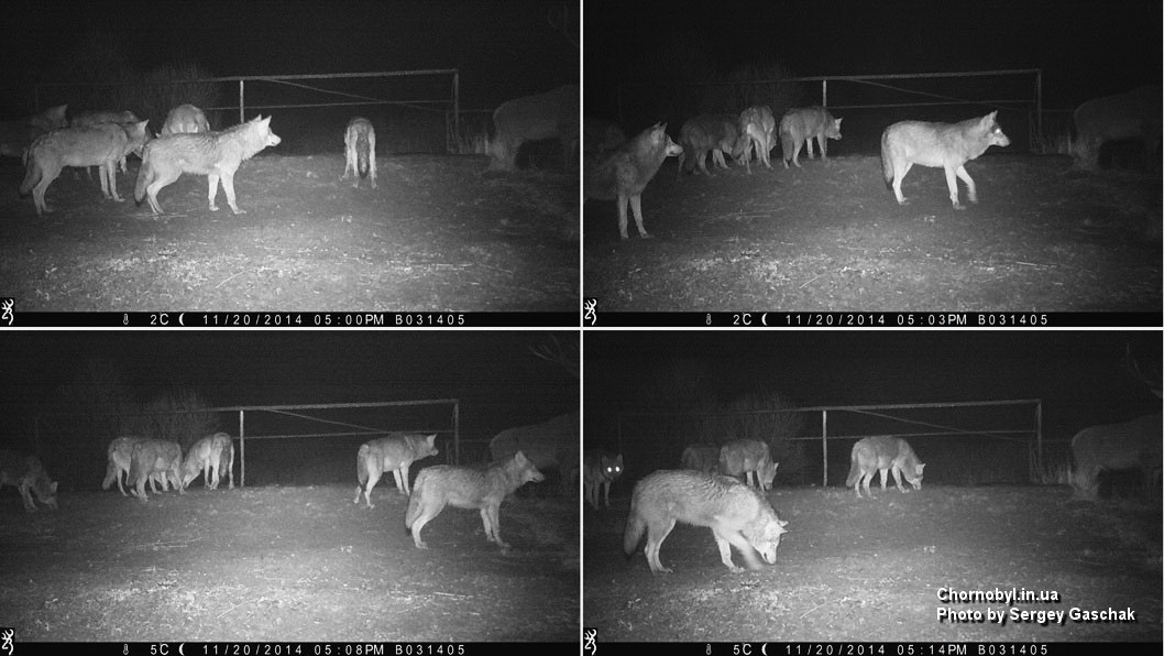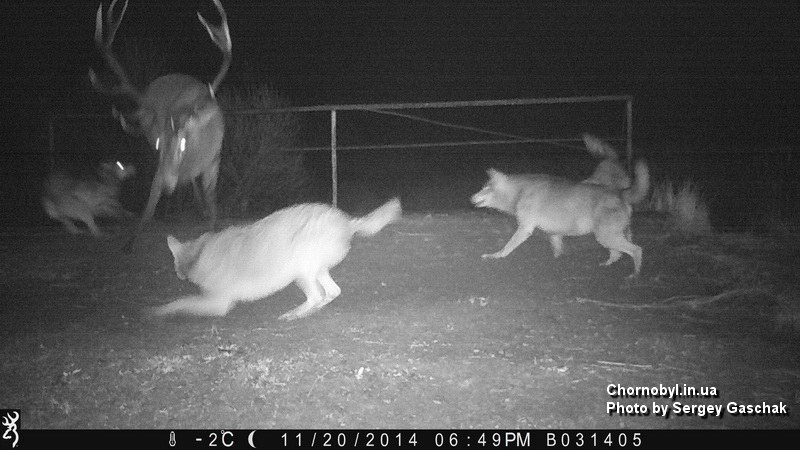 В очередной раз направляясь проверить свои камеры, я ожидал немногого. По опыту, ноябрь-декабрь не самые продуктивные месяцы. Прошлая и пока единственная в зоне фоторегистрация медведя – настолько маловероятный случай (несколько зверей на тысячи и тысячи квадратных километров!), что второй раз подряд – это уже чуть ли не свидетельство массовой миграции косолапых на юг. Дай Бог, чтобы рысь завернула, что-то их мало на этих покрывающихся «бушем» лугах. Но уже на подходе к той же самой камере-обладателе единственного медвежьего приза, мы почувствовали: урожай будет неслабый. За десятки метров до точки в прежде густой траве и в сгрудившихся вокруг деревьях и кустарниках прорисовались четкие вытоптанные тропы. Тут было много зверей. Кабаны? Подходим еще ближе – валяются отдельные свежеобглоданные кости: о, как! Мы возле места трапезы волков, а может не только волков? Адреналин ударил в голову. Участок не очень хорошо просматривается, как бы не оказаться незваными на этом пире. Стал постукивать и покрикивать: вроде бы никого, но ощущение, словно все пригнулись за кустами. Возле камеры – очуметь: словно трактор с бороной прошел, от растительности ничего не осталось! По заведенному правилу, прохожу мимо камеры и только затем ее отключаю. Это делается для проверки работоспособности. На счетчике – более 2800 кадров!!! Такое происходит только летом, когда растительность шатается перед инфракрасным детектором, либо если камера вышла из строя. Но здесь очевидно, фотоловушку напрягали звери. Что же тут происходило? Вставив карту памяти в планшет, вижу: вот – я, работает нормально; листаю в обратном порядке – появляются волки, олени. Ситуация начала проясняться, хотя что-то не стыковалось. По следам, звери тут держались долго, на подходе видели кости, значит, волки разделывали добычу, а в кадре – олень живой и скучающие волки. Ладно, потом разберемся. Заменил батареи (они показывали слабый заряд, но, тем не менее, нас сняли), вставил новую карту памяти. И только оторвавшись от камеры, обнаружил, что в 10 м лежит скелет оленя. Мои мозги закоротило: почему на кадрах нет «пира»?.. Они же точно должны были его туда-сюда таскать!..