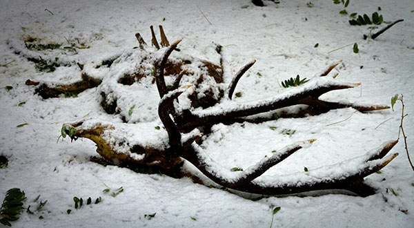 Характерно, что с волками по большей части лисы и енотовидки старались не пересекаться. А вот между собой демонстрировали различные паттерны взаимодействий. Тем не менее, дальше демонстраций дело очевидно не зашло. Волки в основном были у туши парой или по одиночке. Третий волк держался на расстоянии и подходил последним – очевидно, в силу иерархических особенностей группы. Эта территория является постоянным участком волчьей стаи. Мы не знаем точных границ, но ранее нам удалось закартировать выводковый локус. Интересен также тот факт, что сейчас сезон, когда щенки уже подросли и начали участвовать в охотах, а в стаю вернулись переярки (двух-трех летние волки). Это время активных охот на копытных. Тем не менее «кровожадный хищник» не стремится убивать все живое, как это часто преподносят, а тщательно и нерасточительно использует доступный ресурс в виде падали. Известно, что весной в «бескормицу» процент падали может составлять до 70 % в зависимости от различных факторов – как среды, так и социального статуса волка (в стае или одиночный), его возраста. На последней фотографии видна степень «освоенности» туши. Ничто не пропадет в природе зазря.