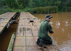 Какой самоход откажется от глотка свежей воды из реки Ильи? Железный мост через реку Илью – знаковое место на маршруте движения самоходов в город Припять. |