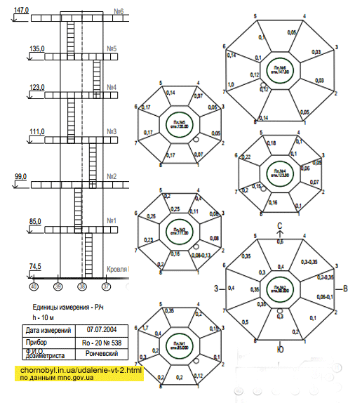 На момент удаления ВТ-2 радиационный фон на конструкциях составляет около 100 — 300 мР/ч. Более наглядная информация о радиационной обстановке на конструкциях ВТ-2 представлено на рисунке (рисунок подготовлен по материалам http://mns.gov.ua/)