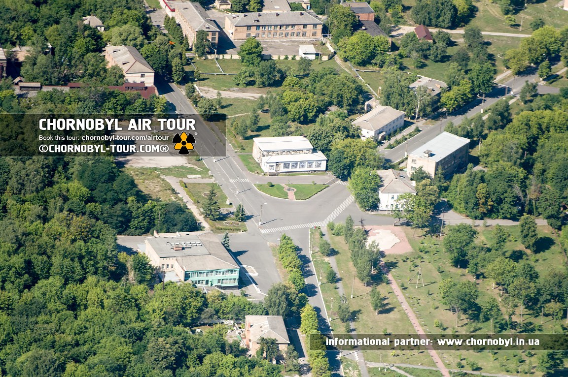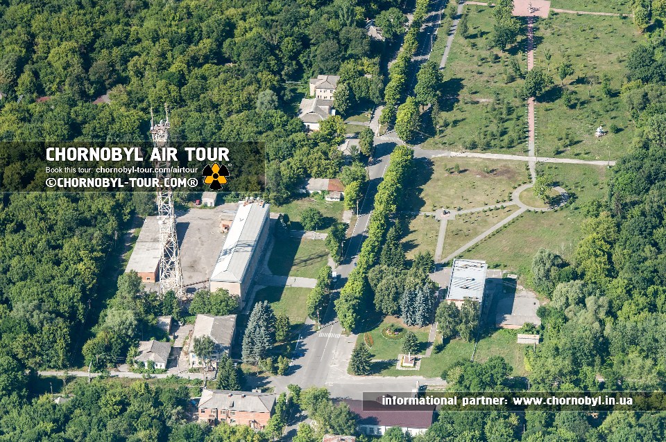 Вид на административную часть города Чернобыль. Администрация зоны отчуждения (внизу справа). Чернобыльская почта и телеграф (внизу слева). Парк мемориал «Звезда Полынь» (справа на фото).